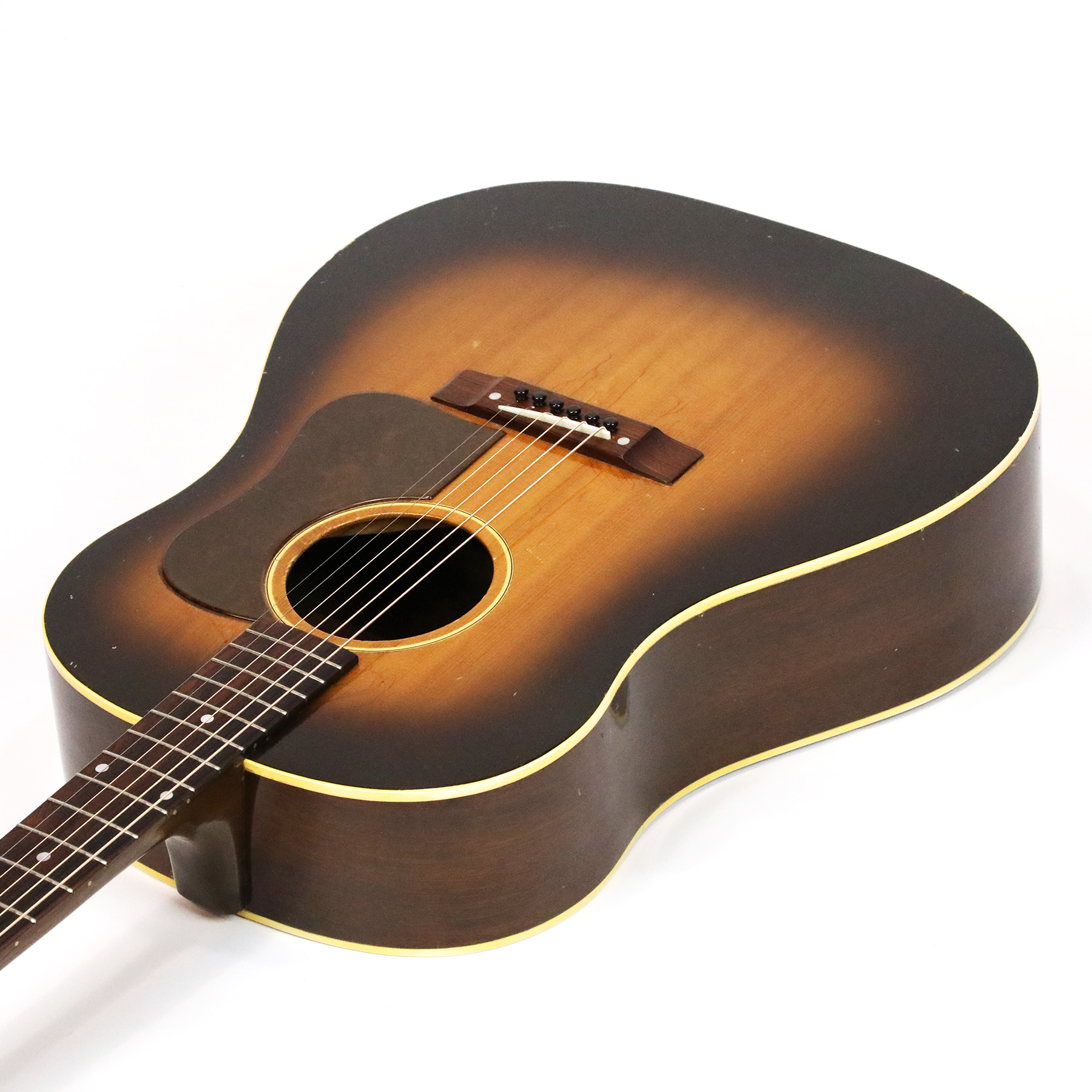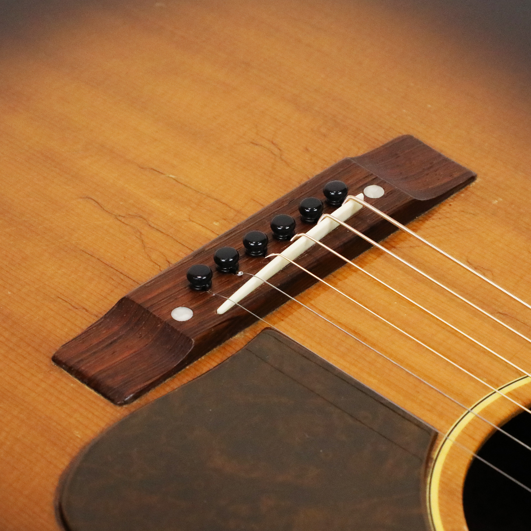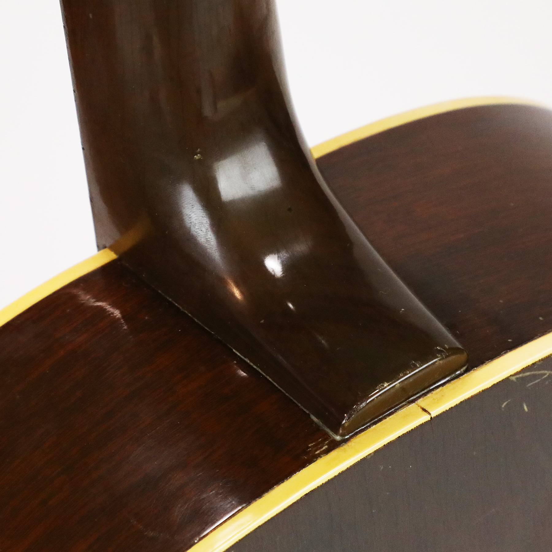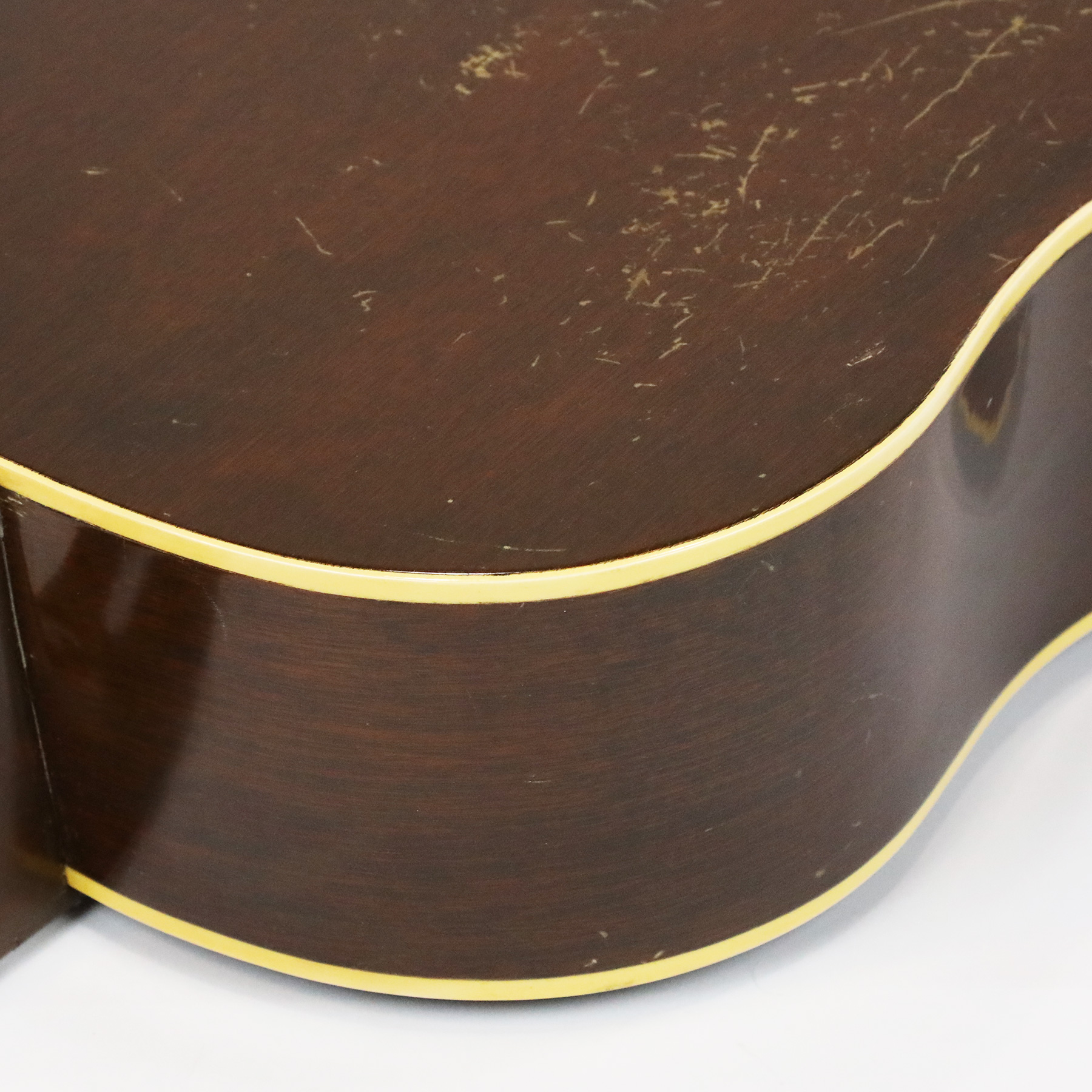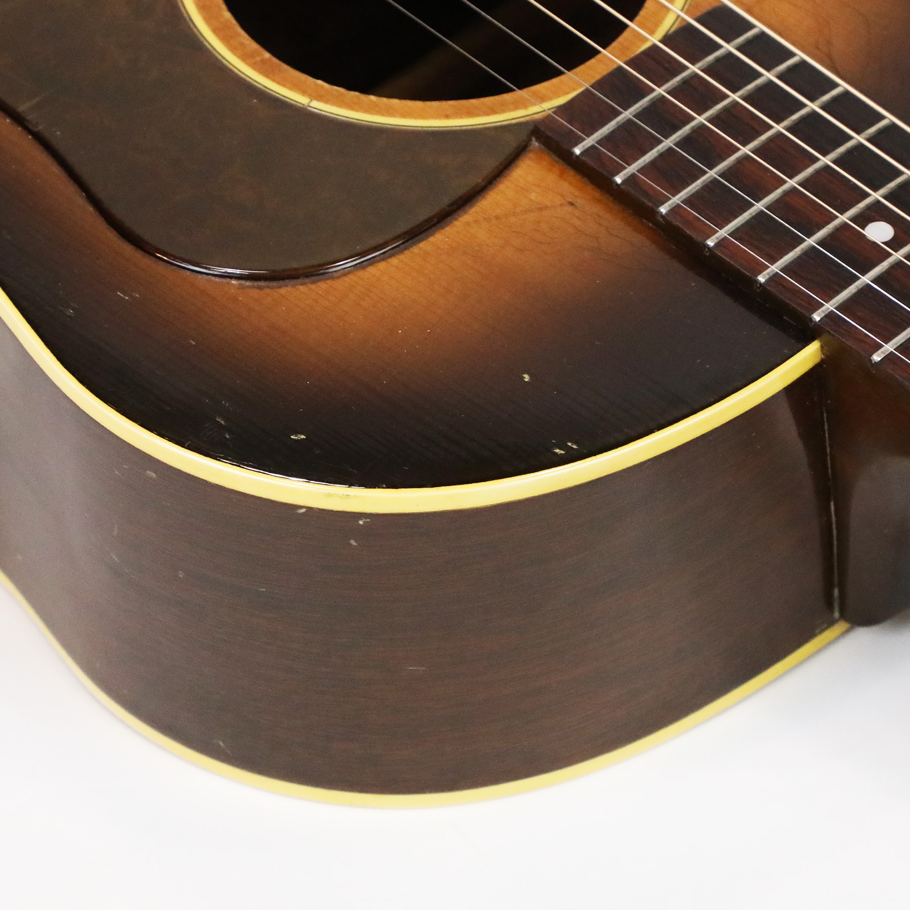 – This is a stunning example with respect to condition and sound. It remains structurally perfect, with no cracks, no breaks, and no repairs. Quite objectively it sounds better than any late-’40s Gibson Jumbo I’ve owned, and that’s most certainly because the neck is a very large completely solid piece of mahogany. This guitar is more resonant and clear than your typical J-45, and it’s not nearly as expensive.