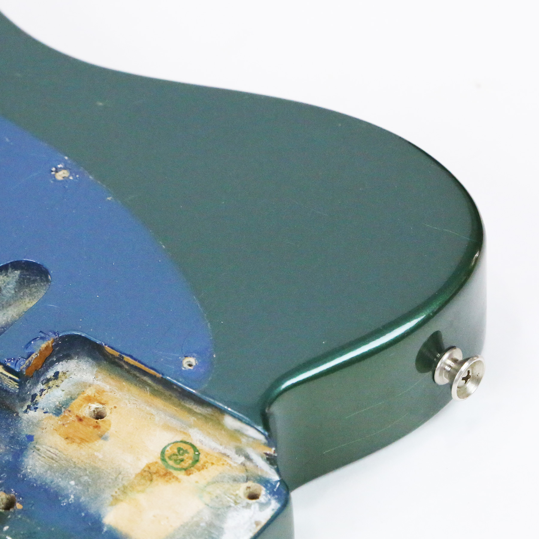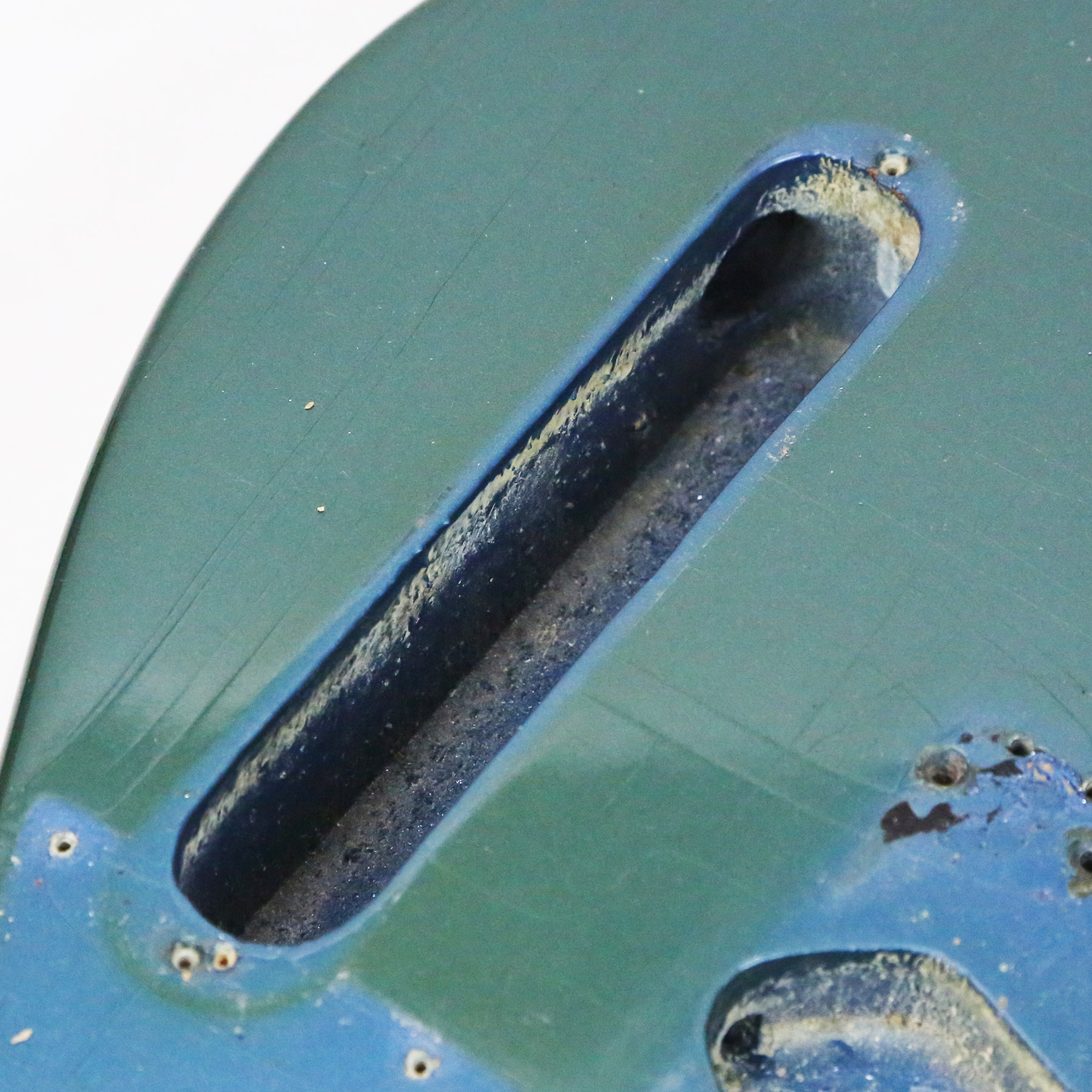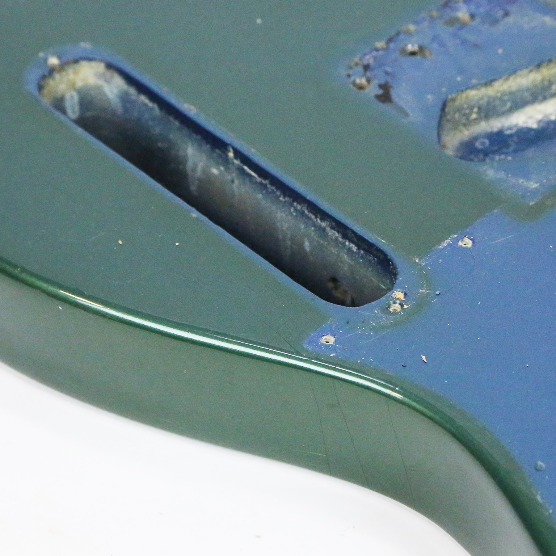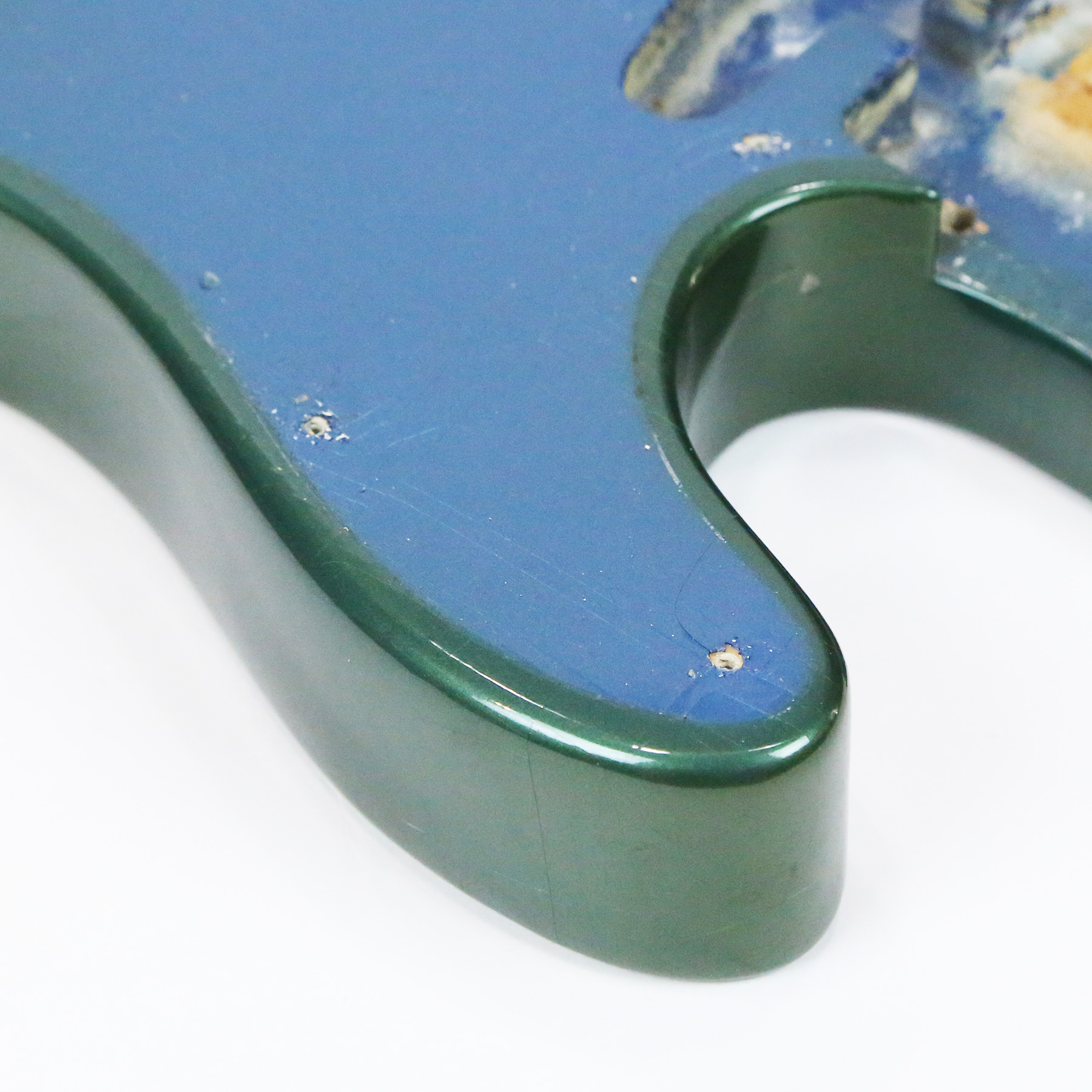 – An absolutely beautiful representation of Fender’s Lake Placid Blue custom color having evolved into a much more desirable nearly Sherwood Green. The body is handsomely weather-checked, sports crisp and bold UV fading lines, and displays moderate evidence of superficial wear otherwise.
