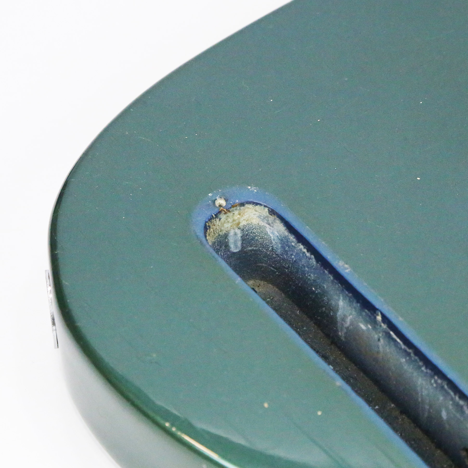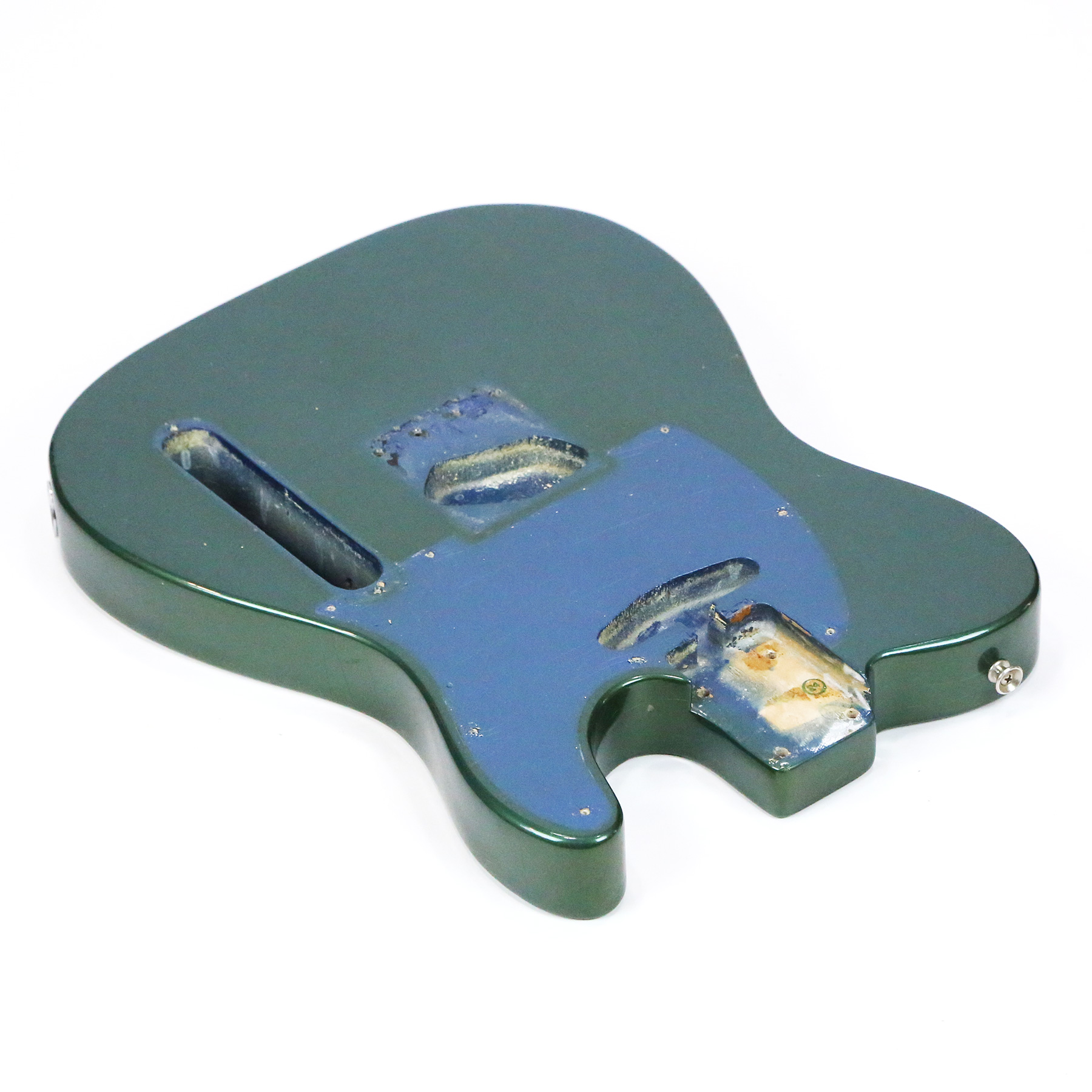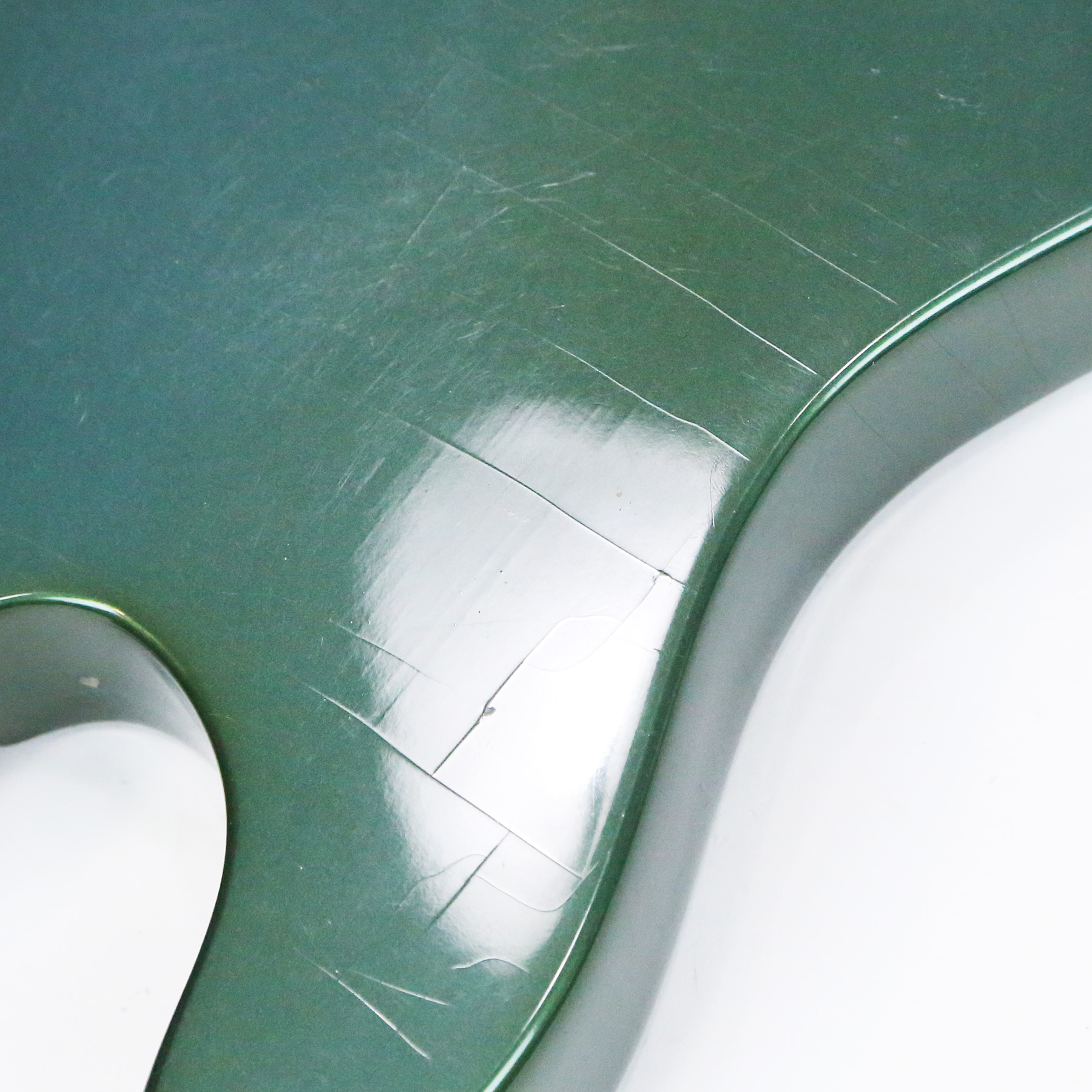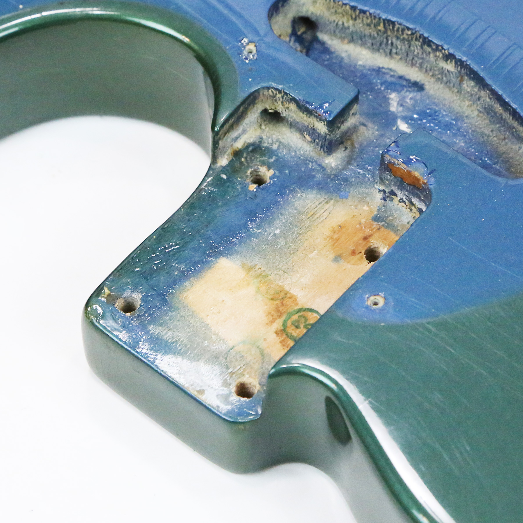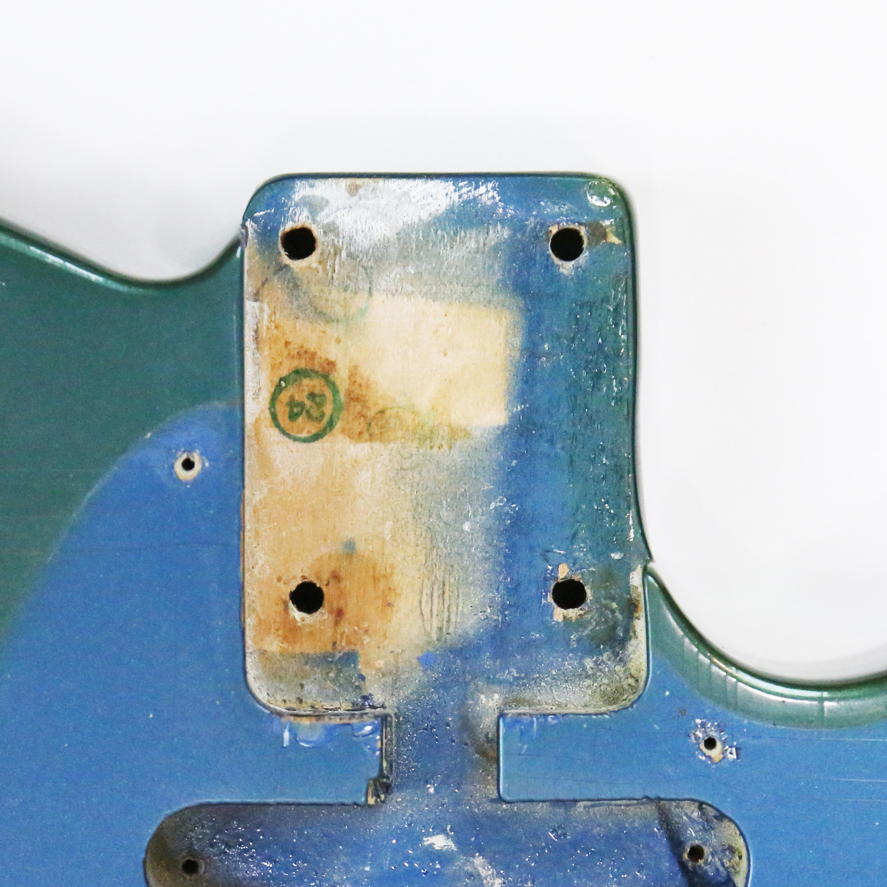 – An absolutely beautiful representation of Fender’s Lake Placid Blue custom color having evolved into a much more desirable nearly Sherwood Green. The body is handsomely weather-checked, sports crisp and bold UV fading lines, and displays moderate evidence of superficial wear otherwise.