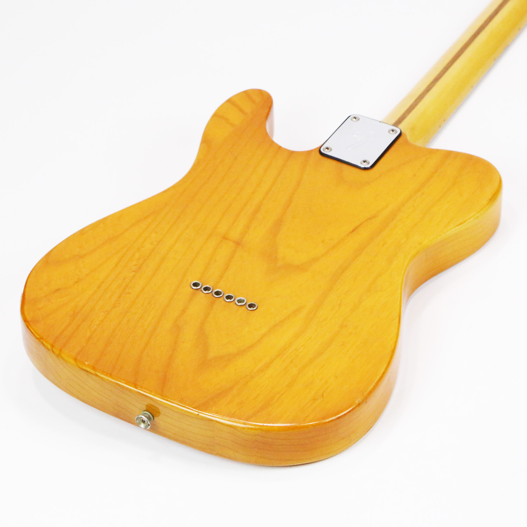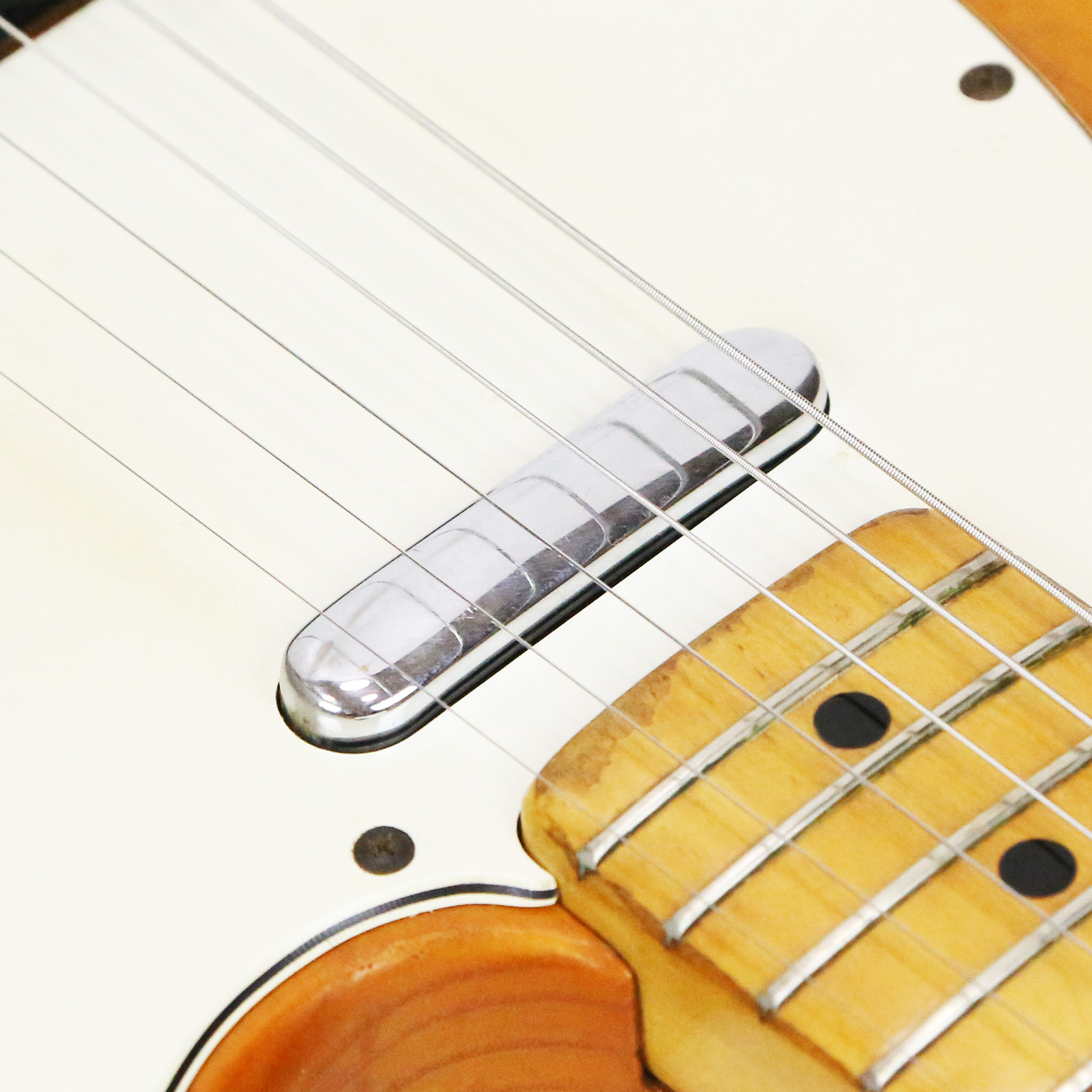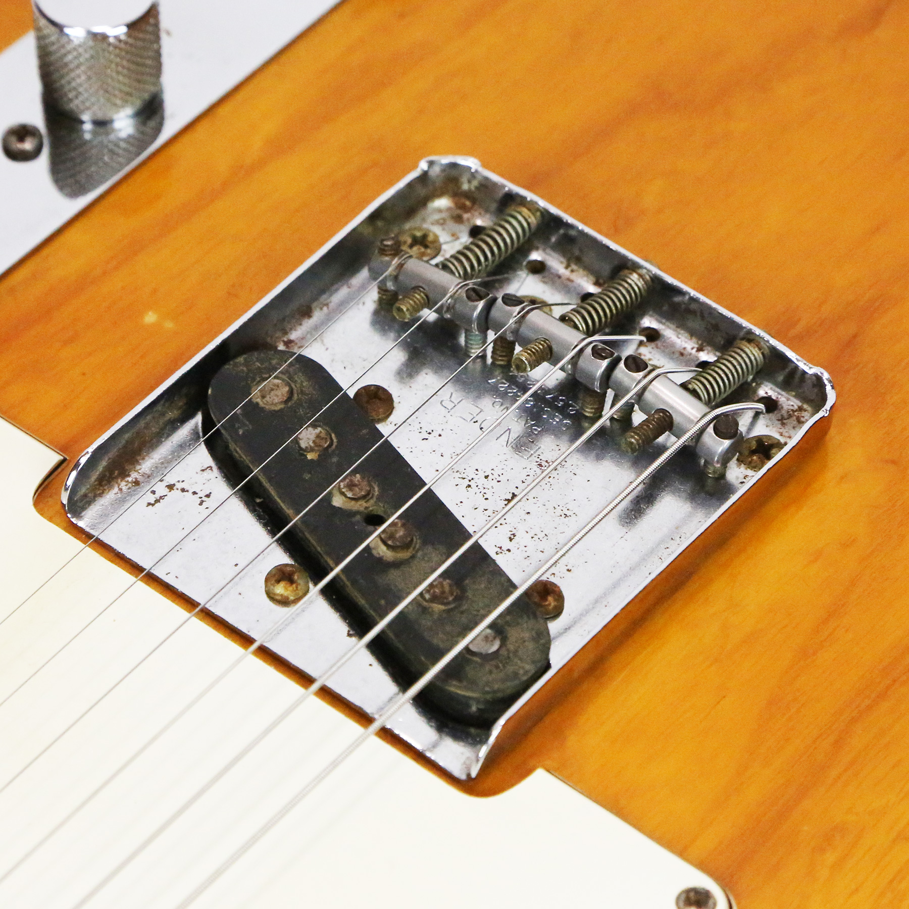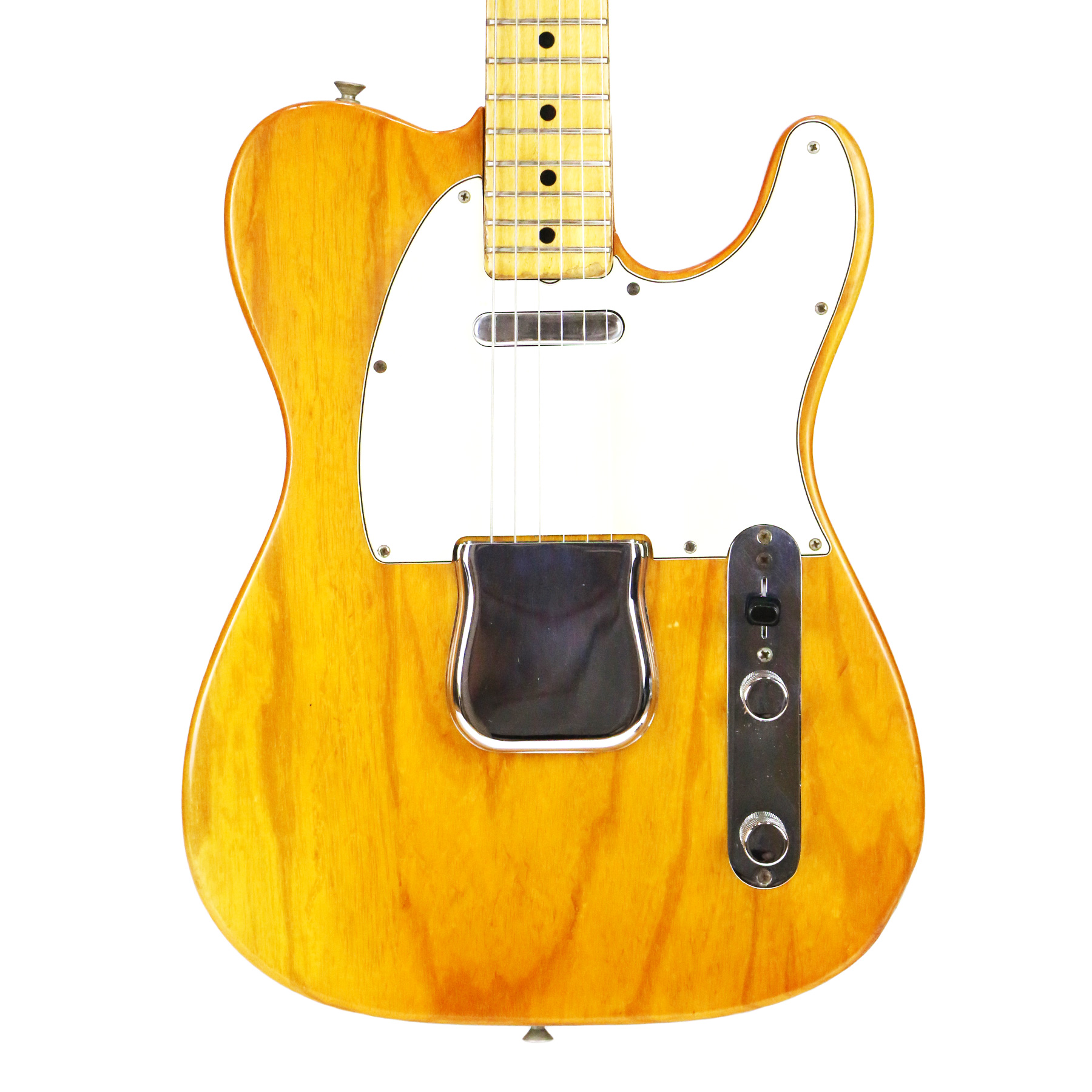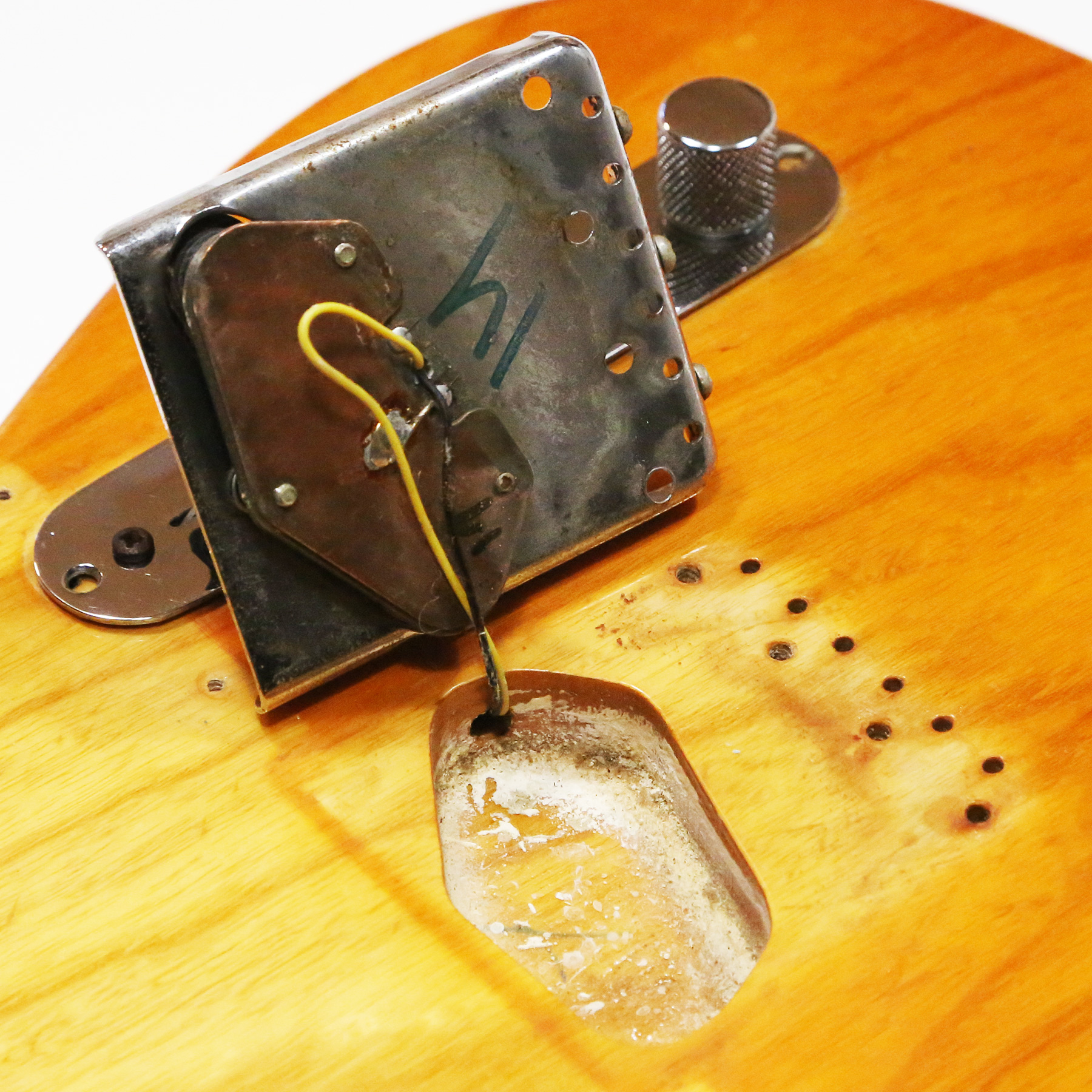 – A handsome survivor with attractive patina, this late white guard Tele displays a wonderful butterscotch yellowing to the natural finish. The clear polyurethane finish has evolved into a wonderful butterscotch color from UV-induced darkening. It does not smell of smoke and doesn’t emit an odor.
