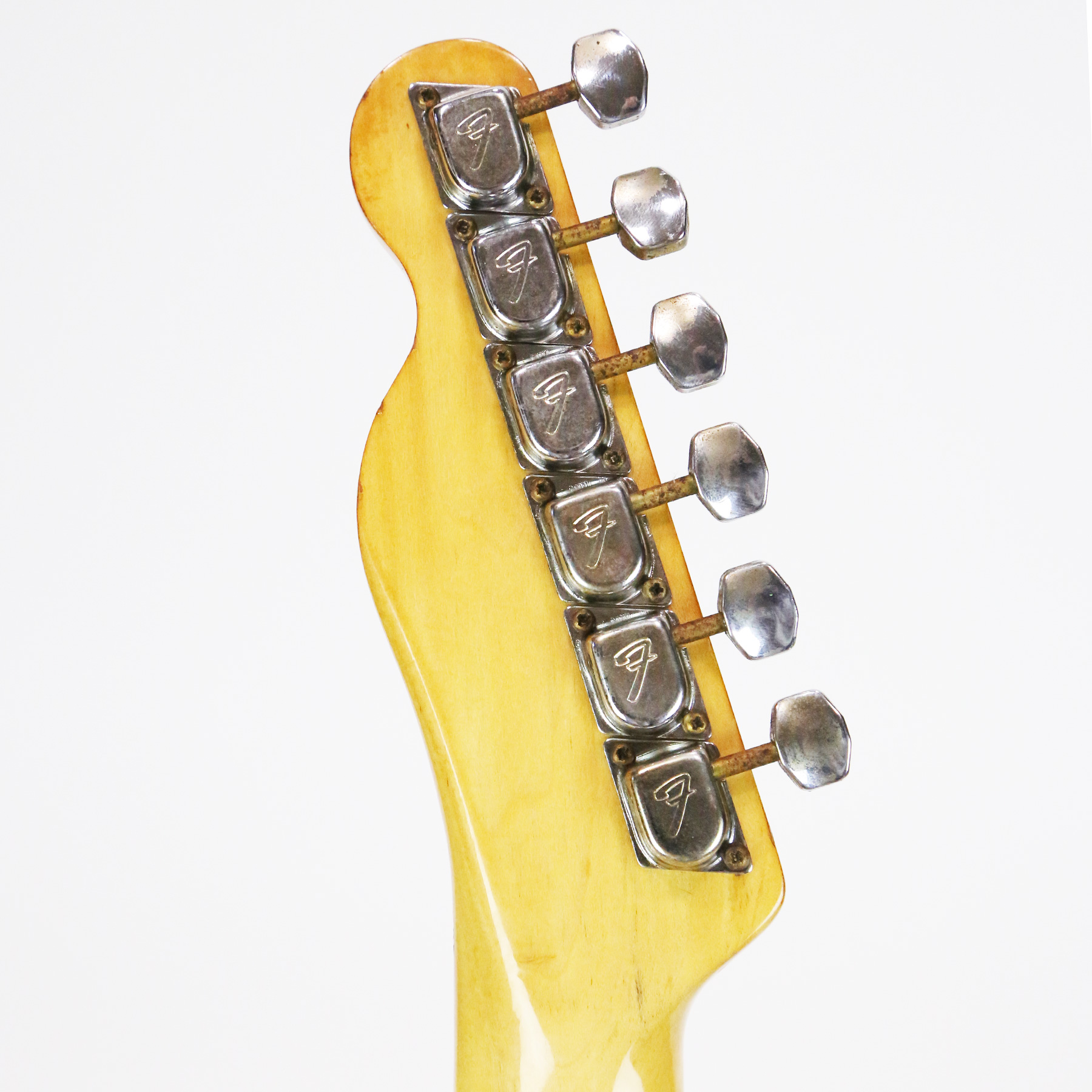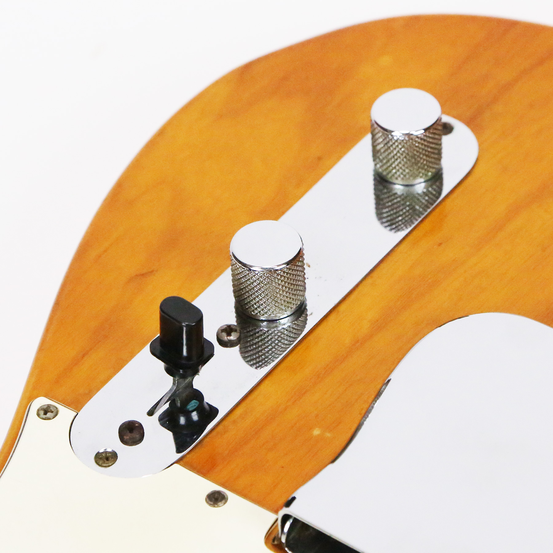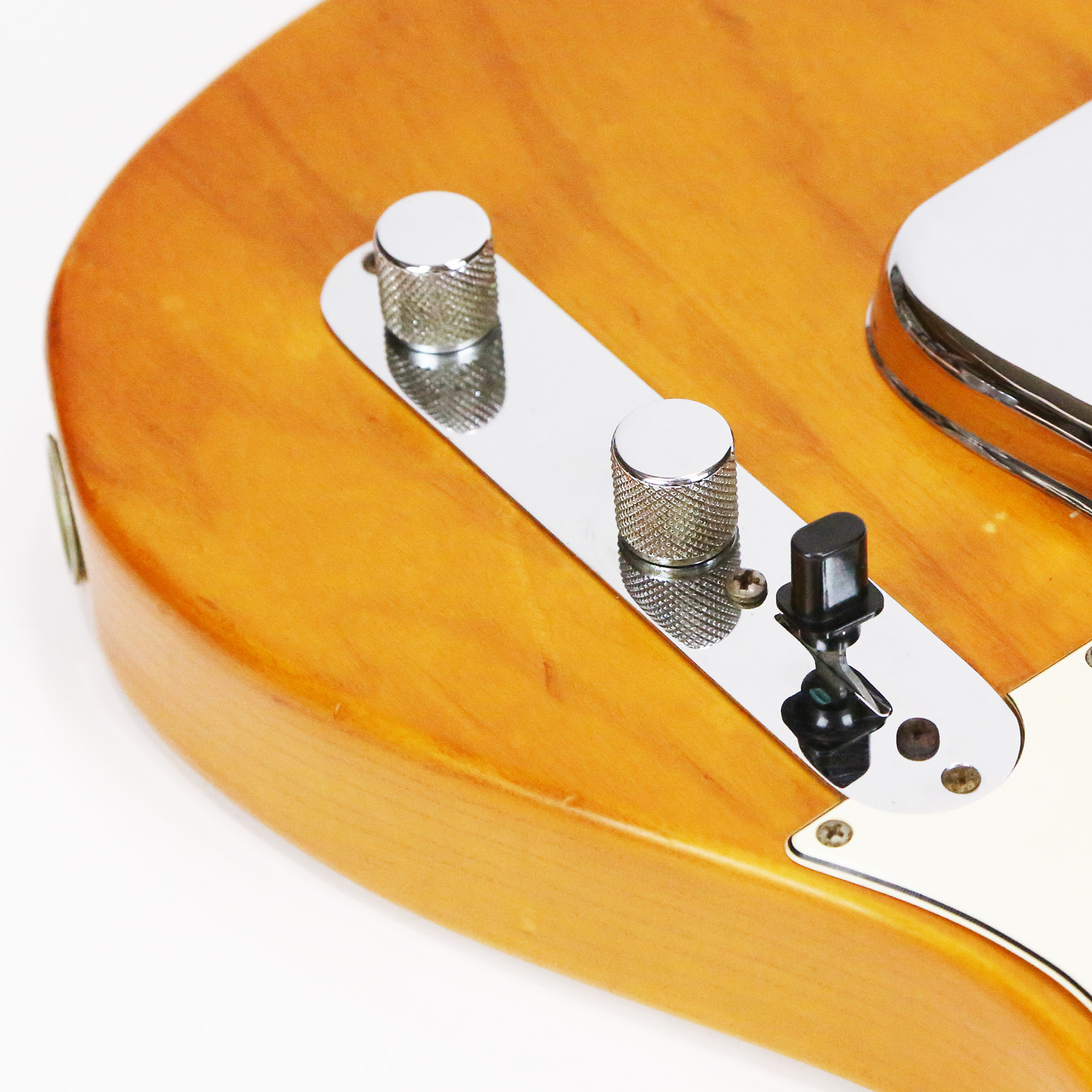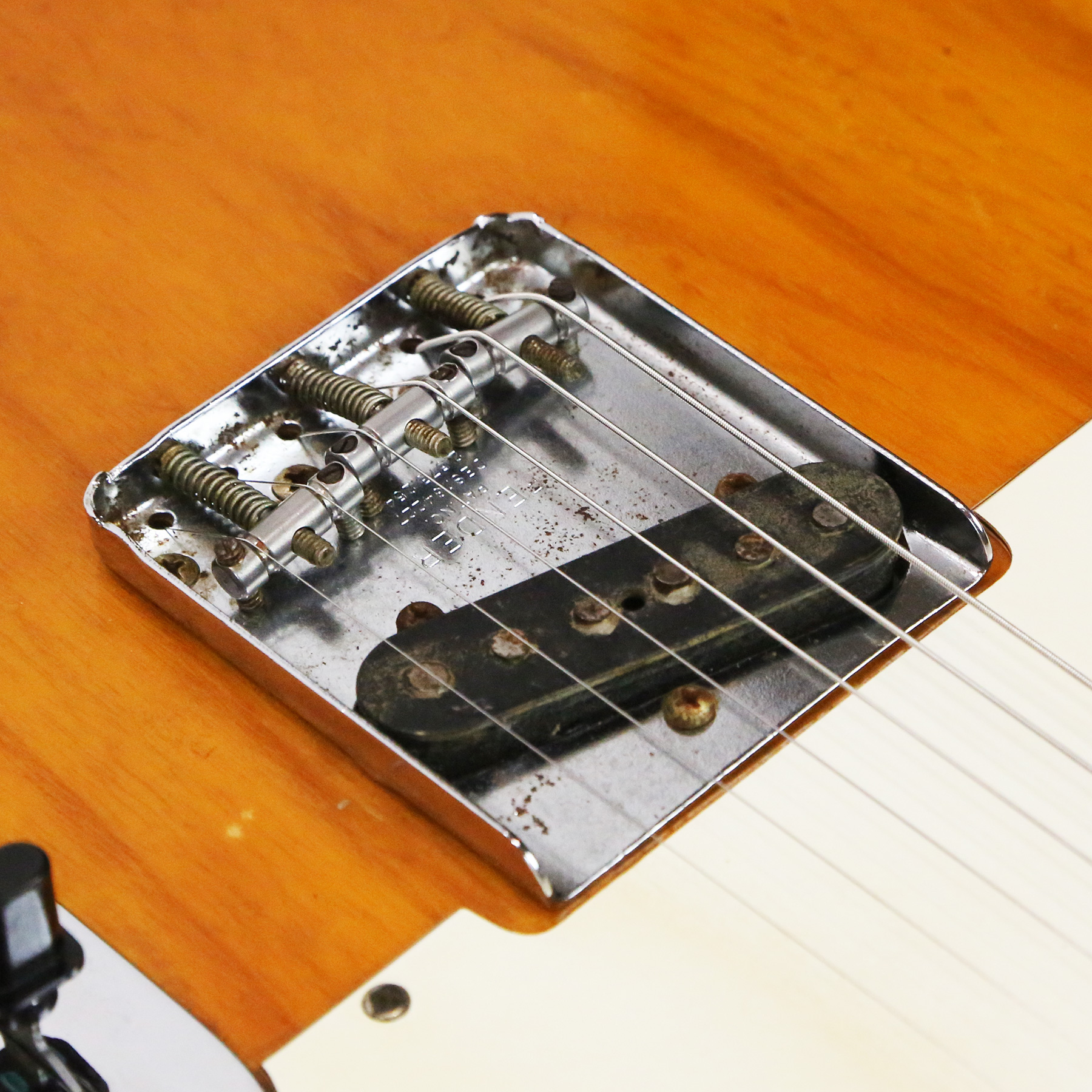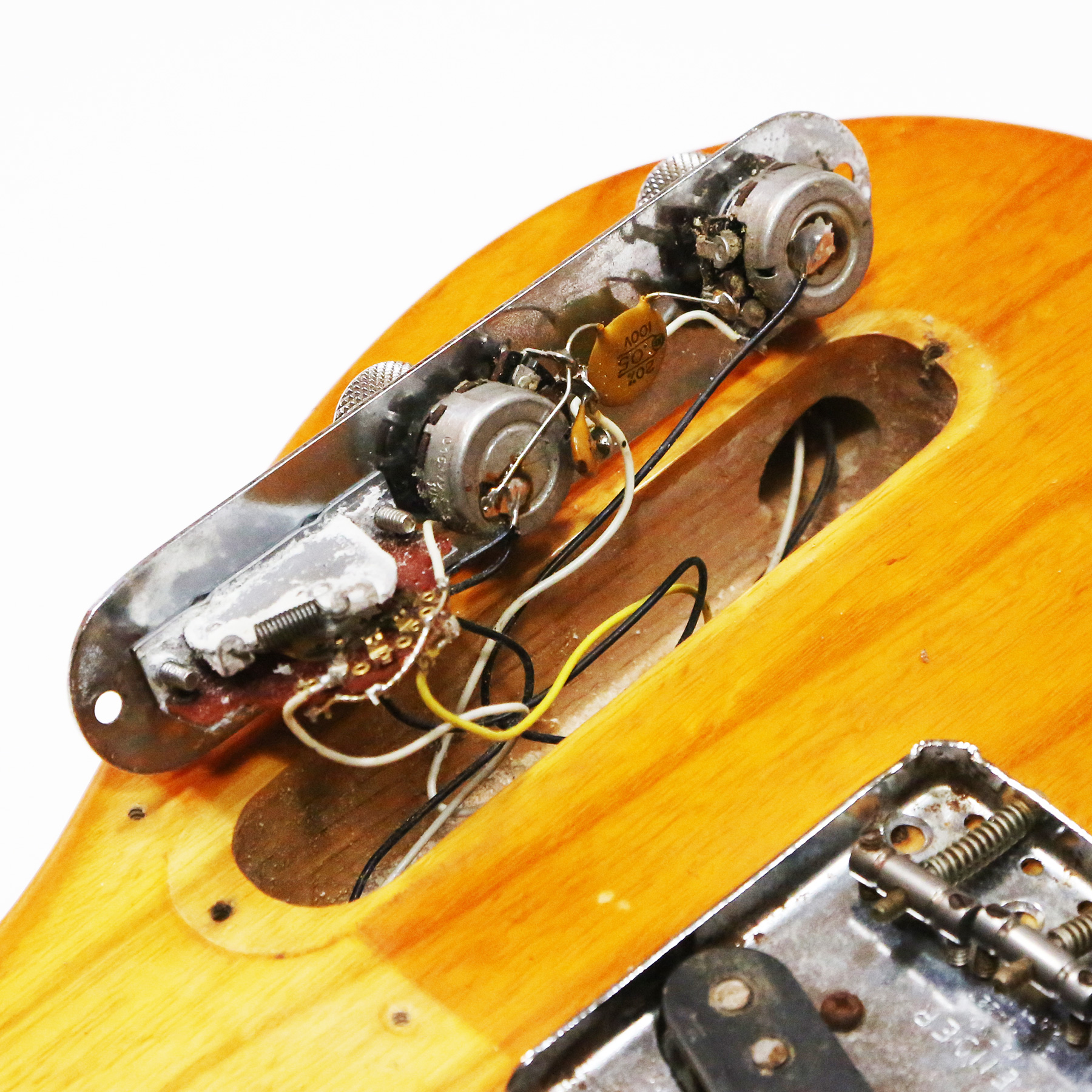 – A handsome survivor with attractive patina, this late white guard Tele displays a wonderful butterscotch yellowing to the natural finish. The clear polyurethane finish has evolved into a wonderful butterscotch color from UV-induced darkening. It does not smell of smoke and doesn’t emit an odor.