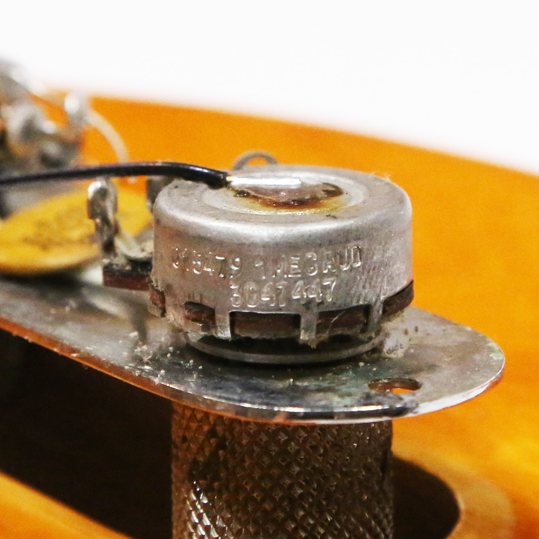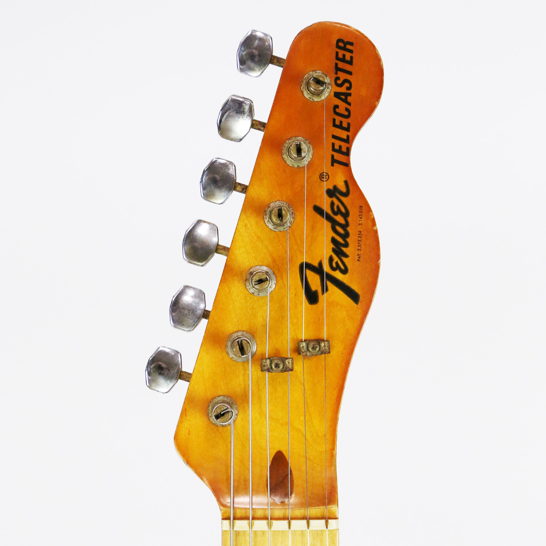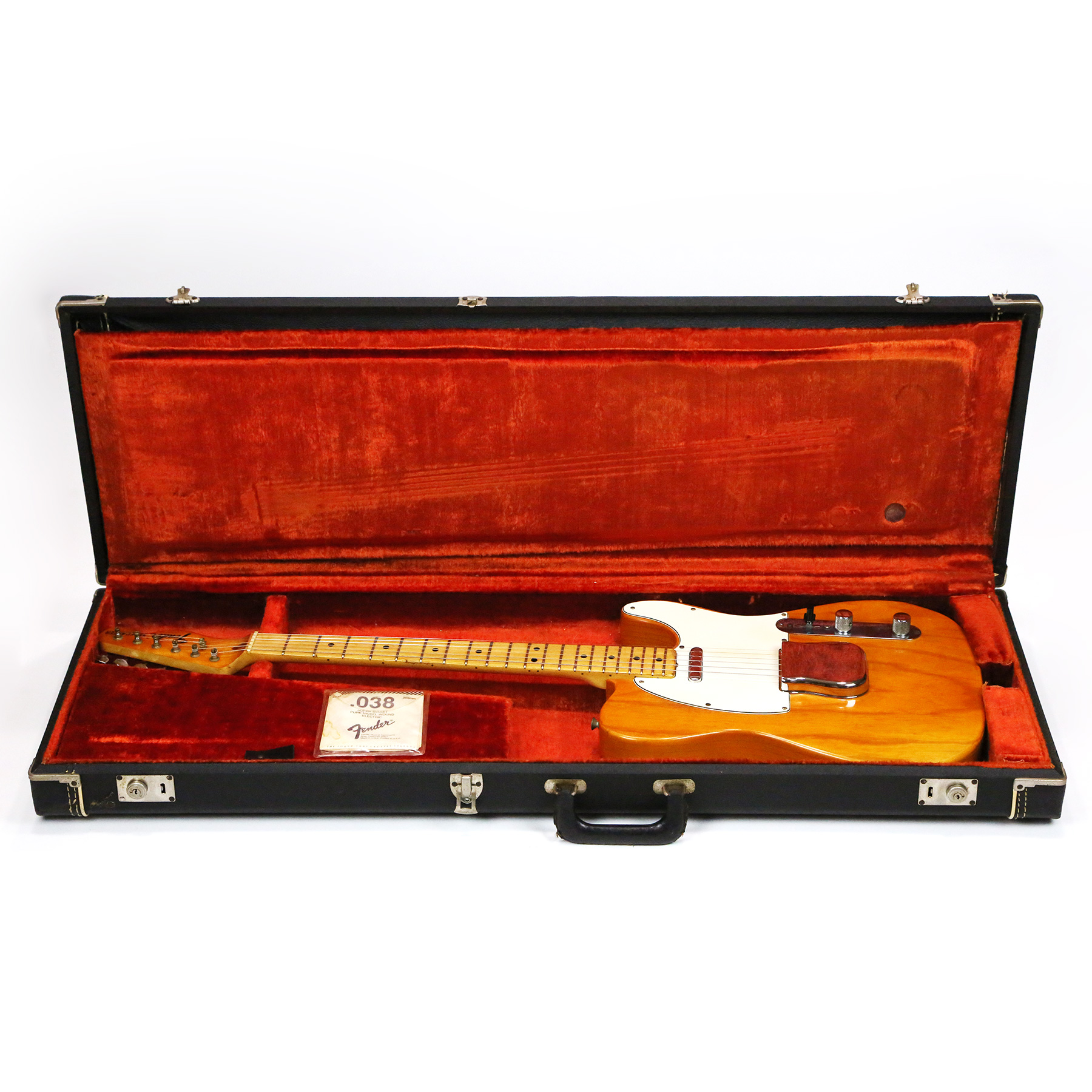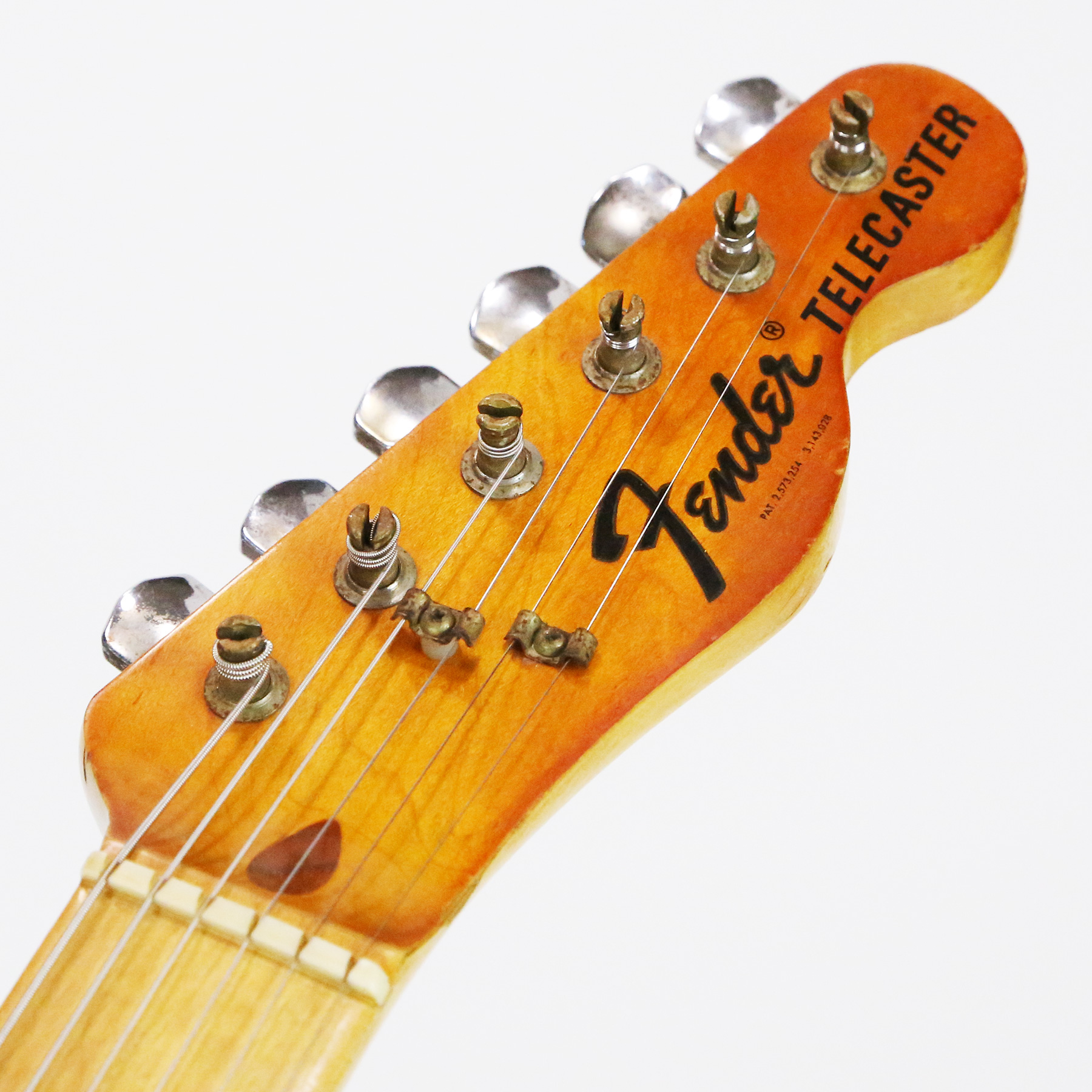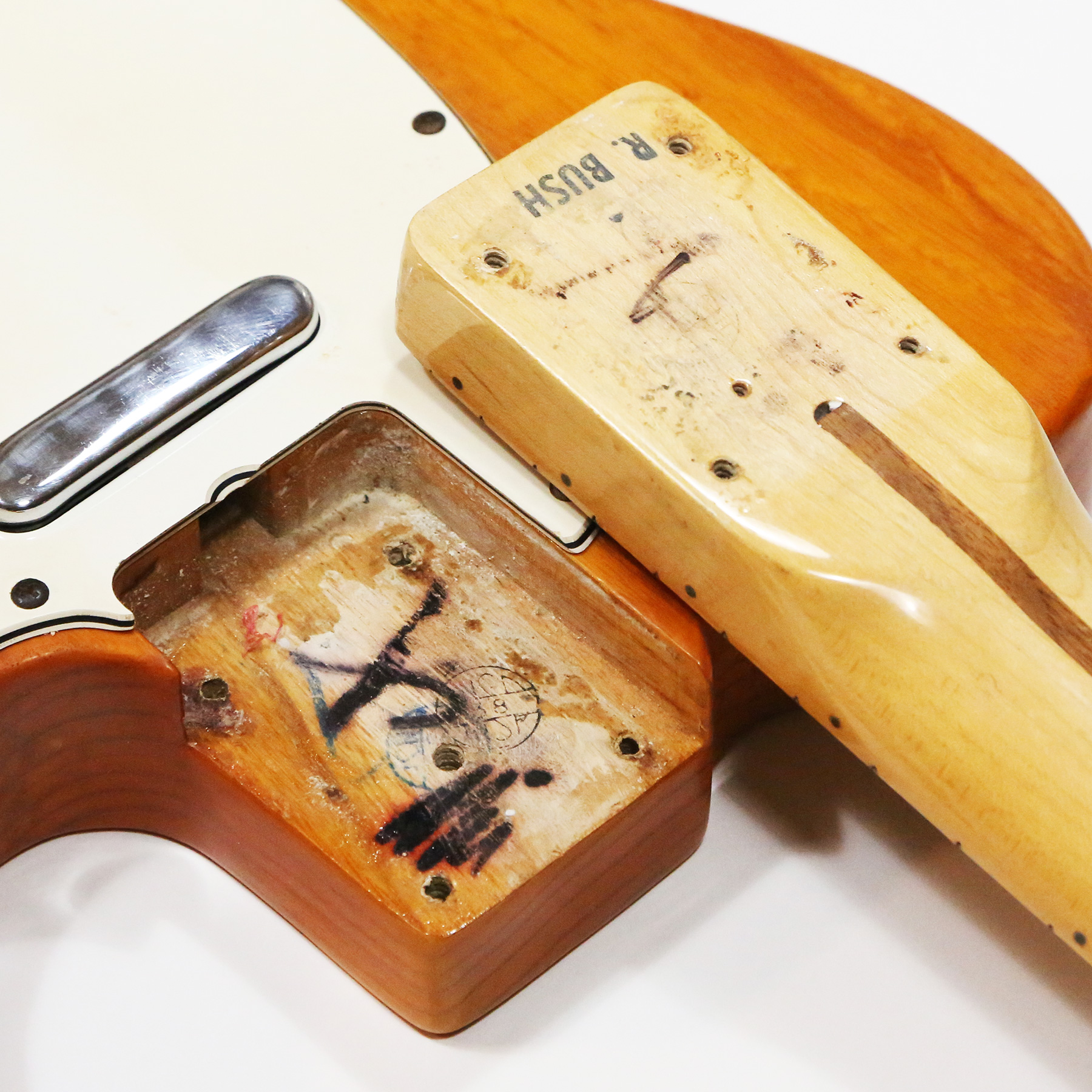 – A handsome survivor with attractive patina, this late white guard Tele displays a wonderful butterscotch yellowing to the natural finish. The clear polyurethane finish has evolved into a wonderful butterscotch color from UV-induced darkening. It does not smell of smoke and doesn’t emit an odor.