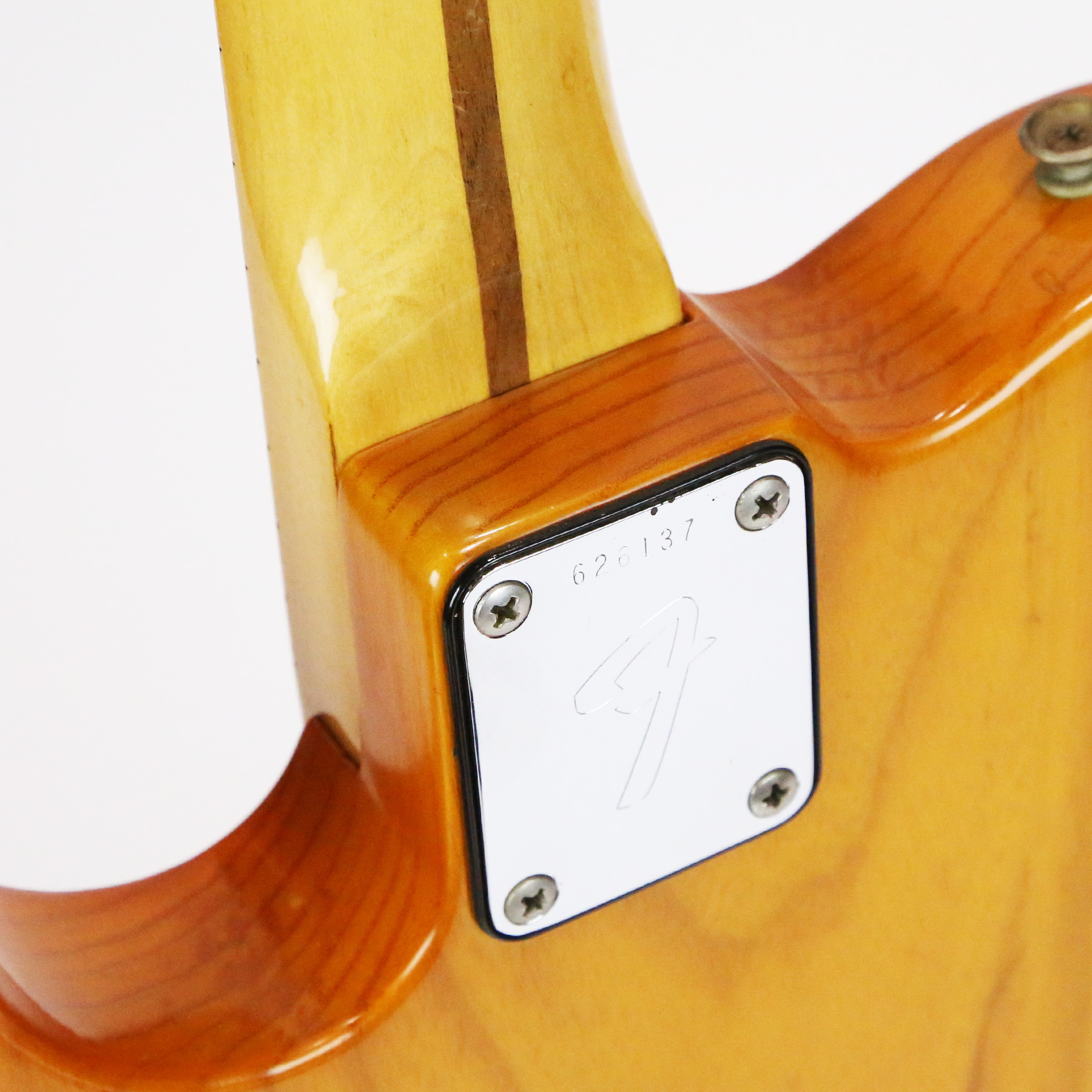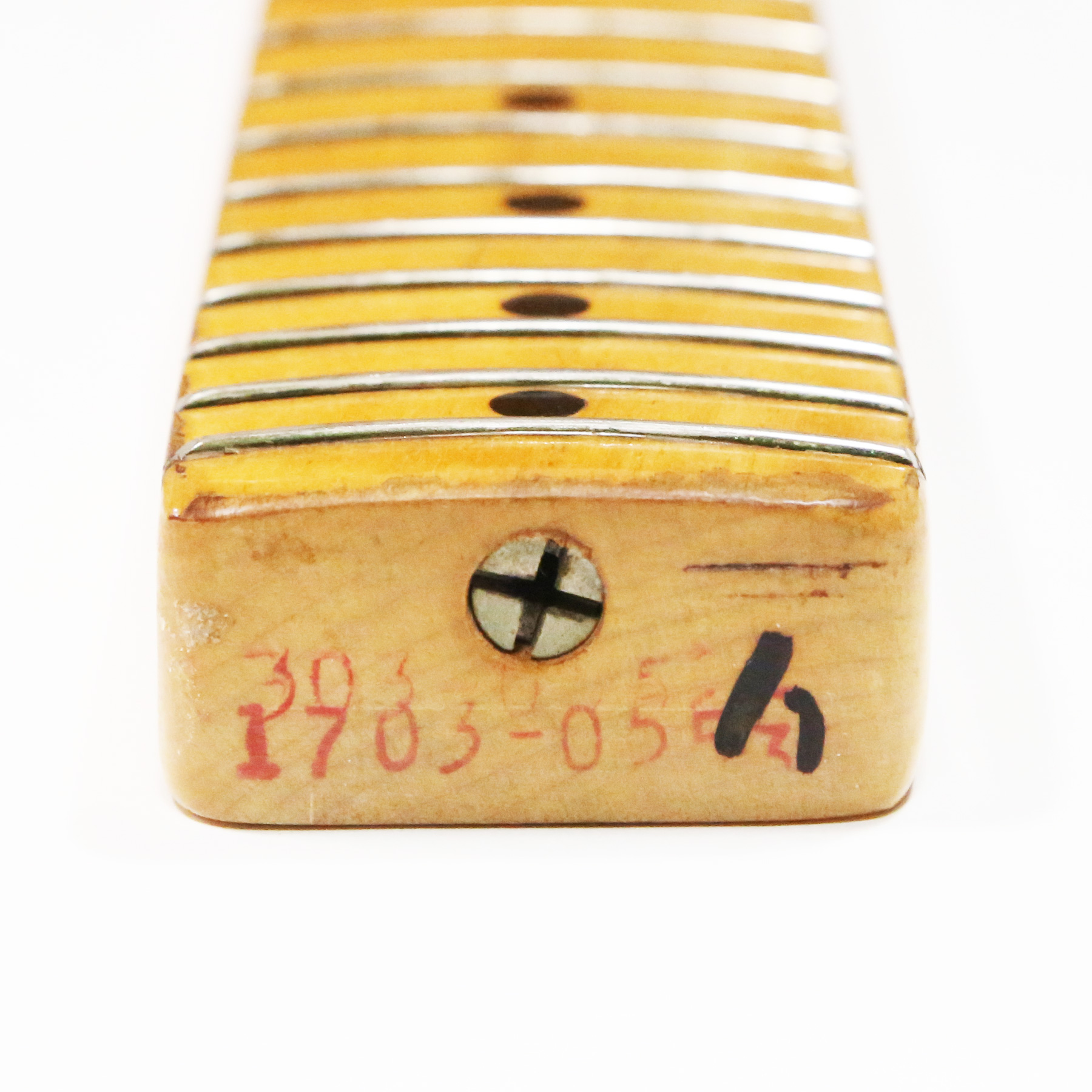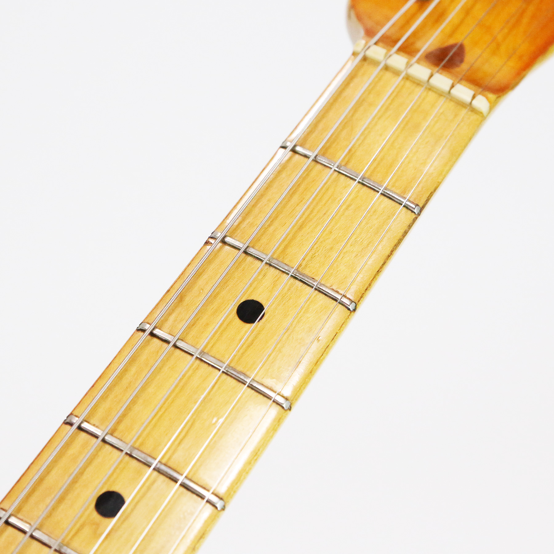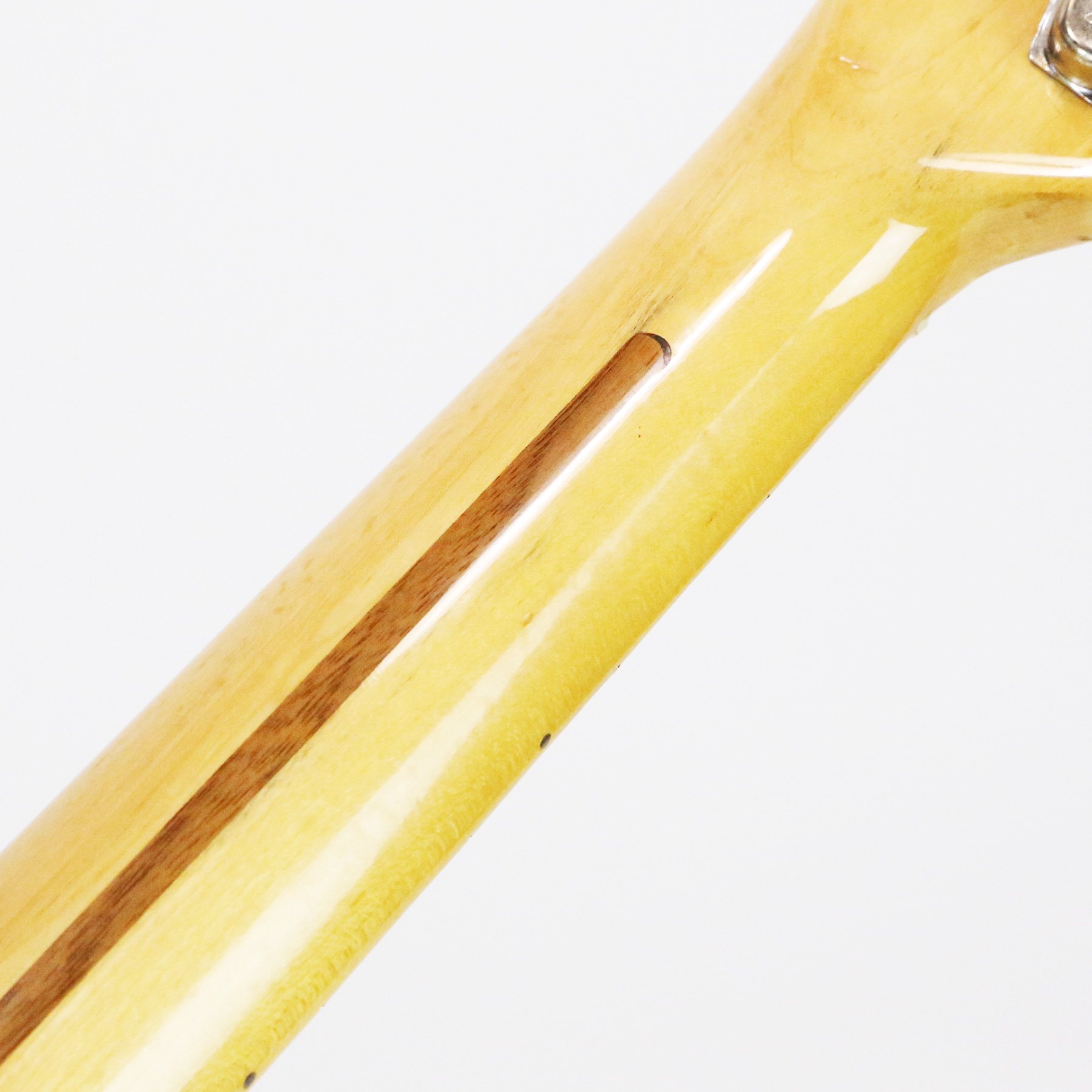– The medium C-shape profile skunk-stripe maple neck feels incredibly comfortable. It retains original factory frets with plenty of life left.