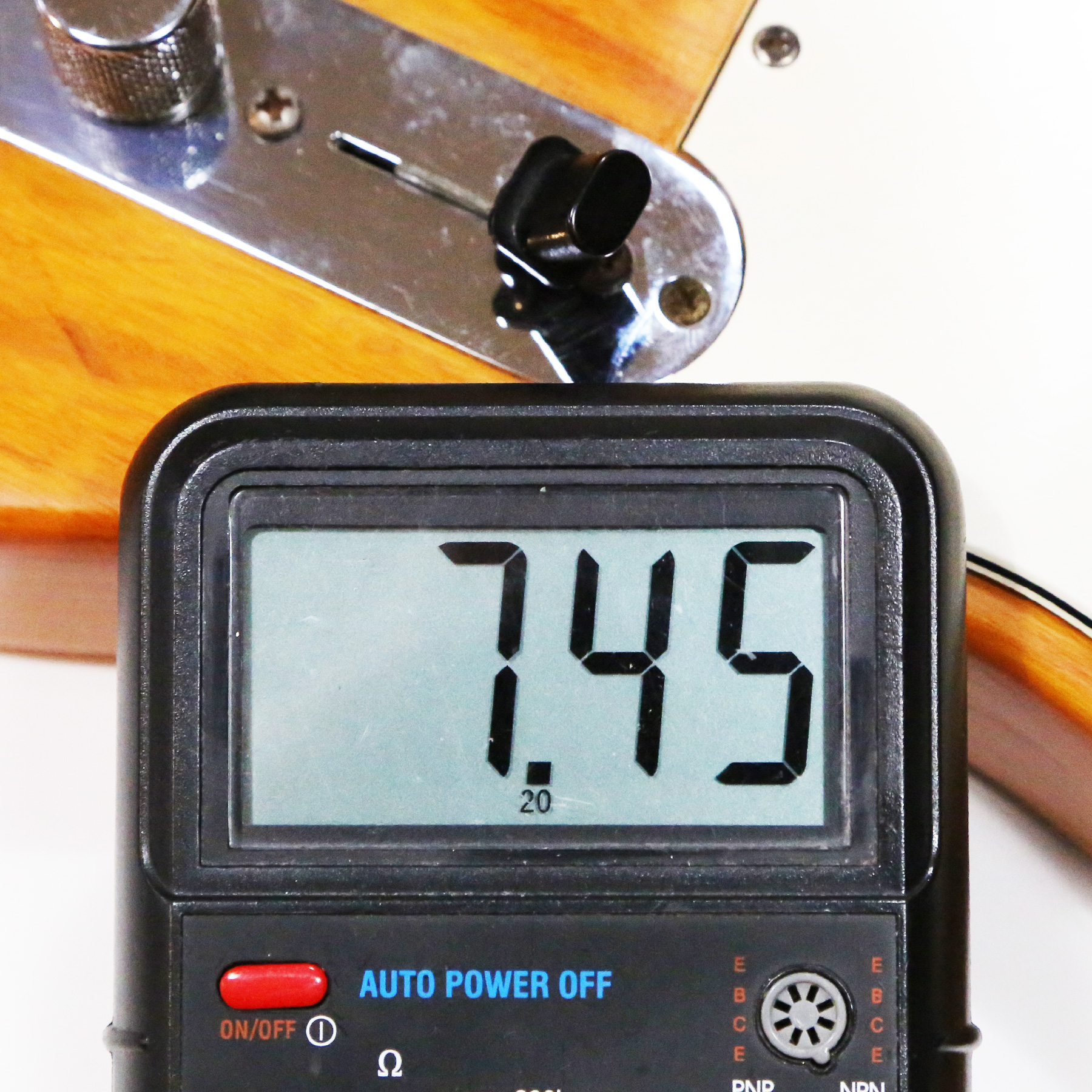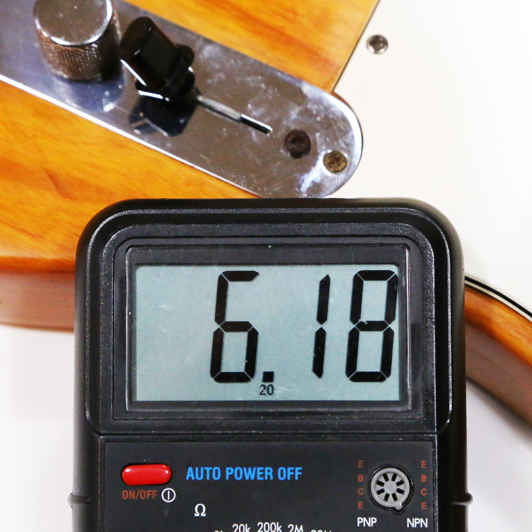 – Pickup measurements: 6.18 kOhm (bridge), 7.45 kOhm (neck).
