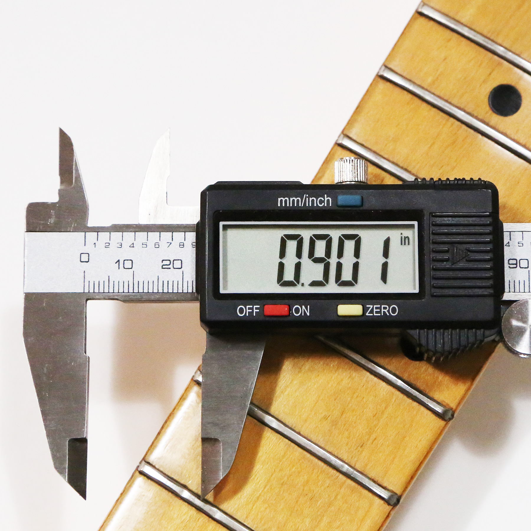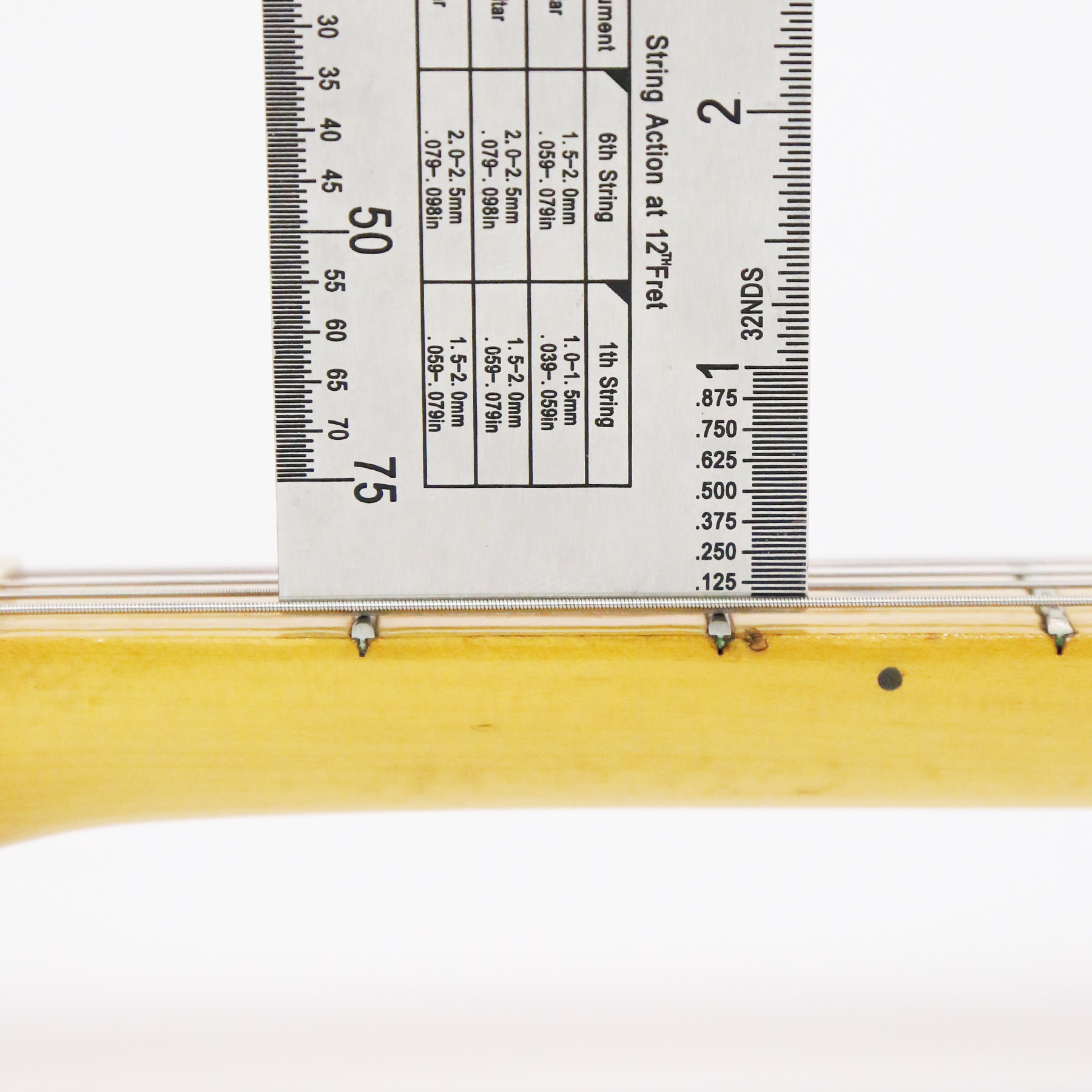 – Neck measurements: 1.627″ nut width, .877″ depth at 1st fret, .901″ depth at 12th fret.