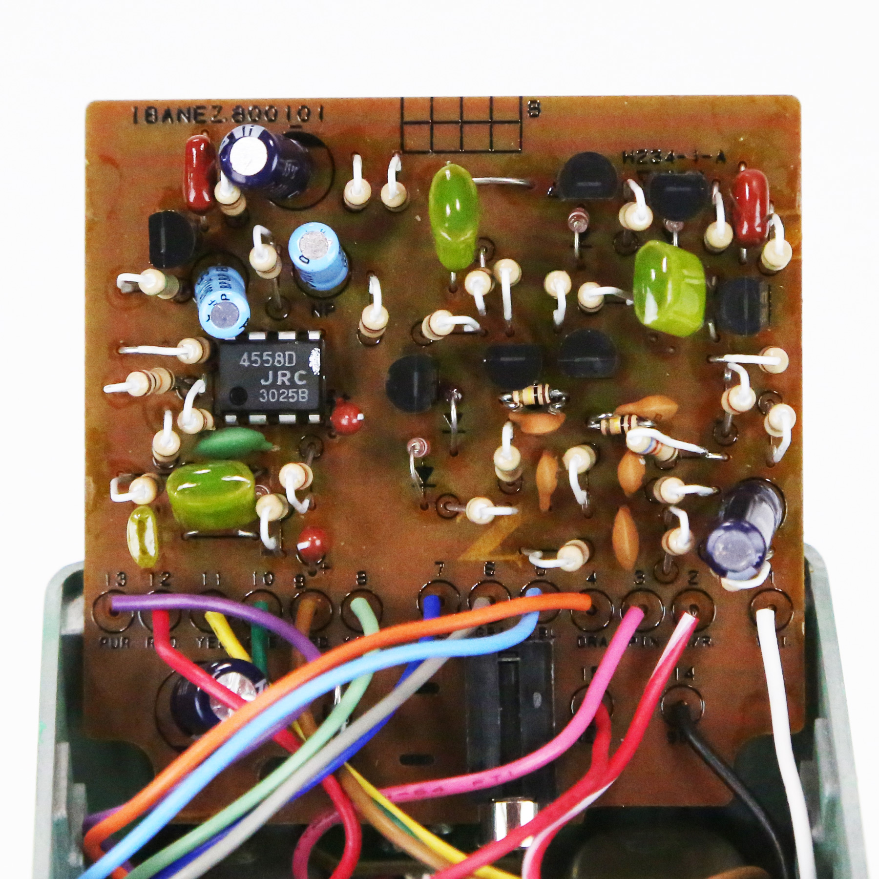 – The black label features a large “CE”, and both the circuit and battery clip display the Ibanez designation (post-’02).