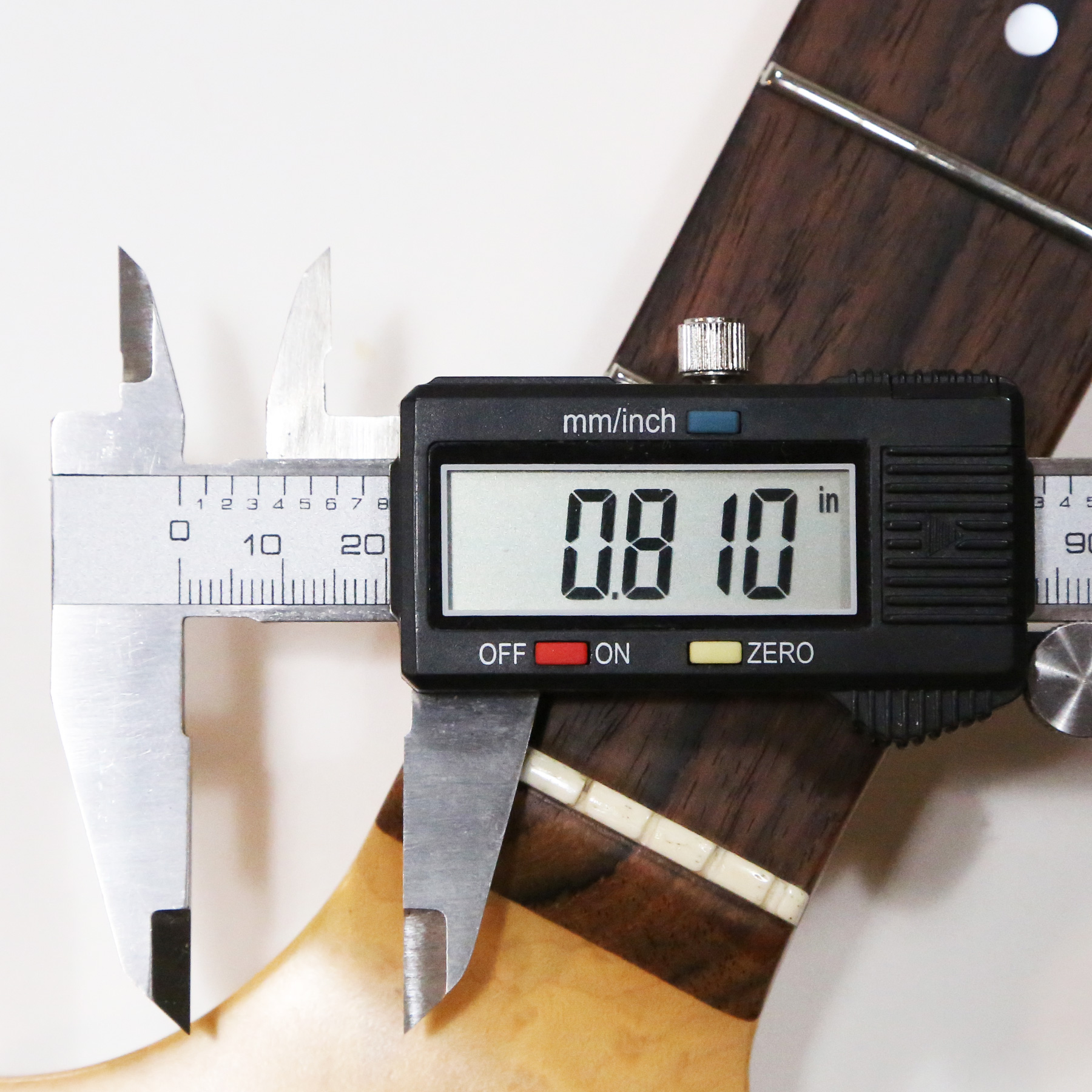 – Neck measurements: 1.636″ nut width, .810″ neck depth at 1st fret, .859″ neck depth at 12th fret
