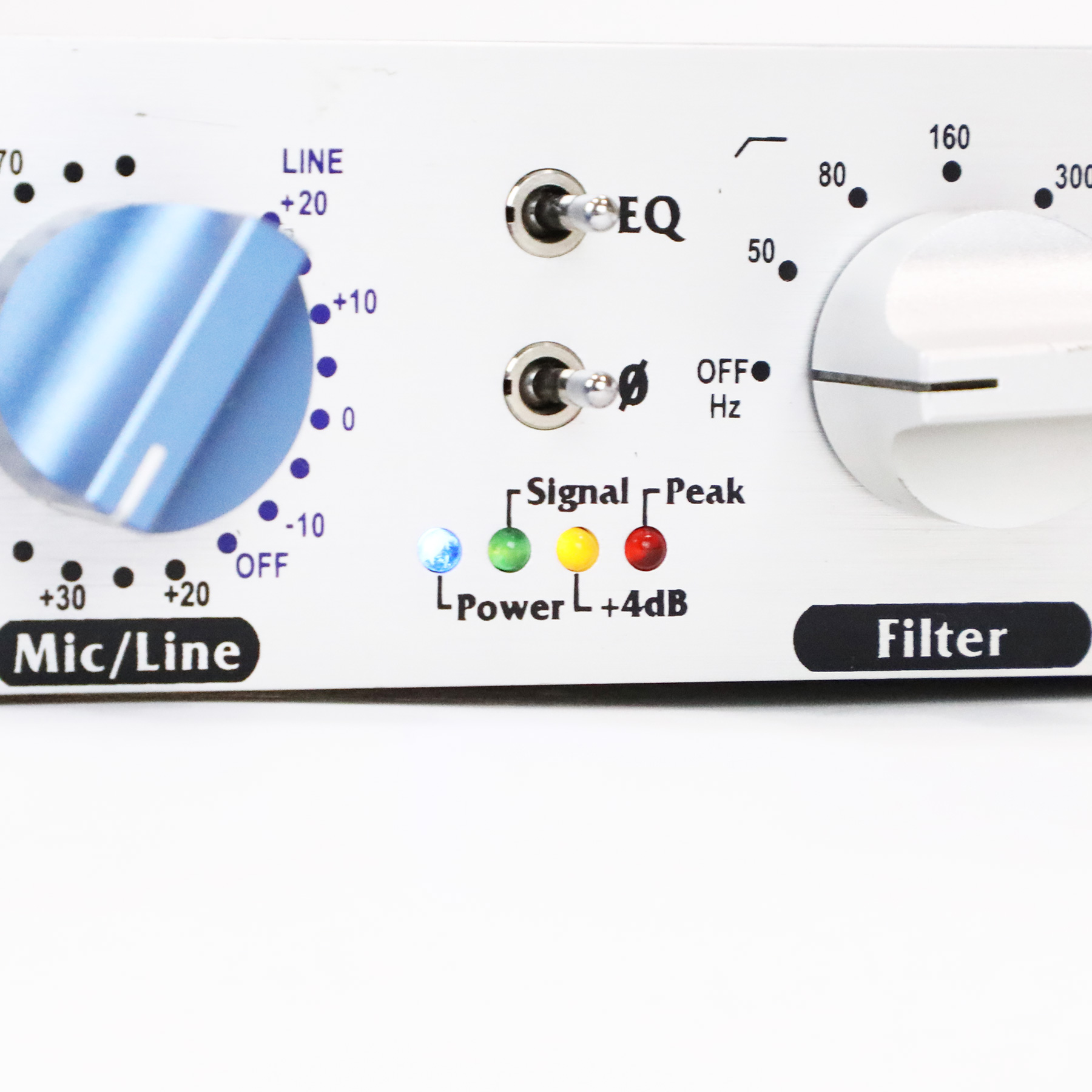 – SPECS: Fully balanced transformer mic and line inputs, Balanced XLR output Hi-Z direct input for instruments on the front panel LED input metering, *NEW Selectable mic impedance switch (300 or 1200 Ohms), *NEW 48VDC phantom power switch, 180 degree phase reversal switch, 20 position gold contact ELMA rotary gain switch for both Mic and Line sections, Output level control functions as a fader when going straight to tape.